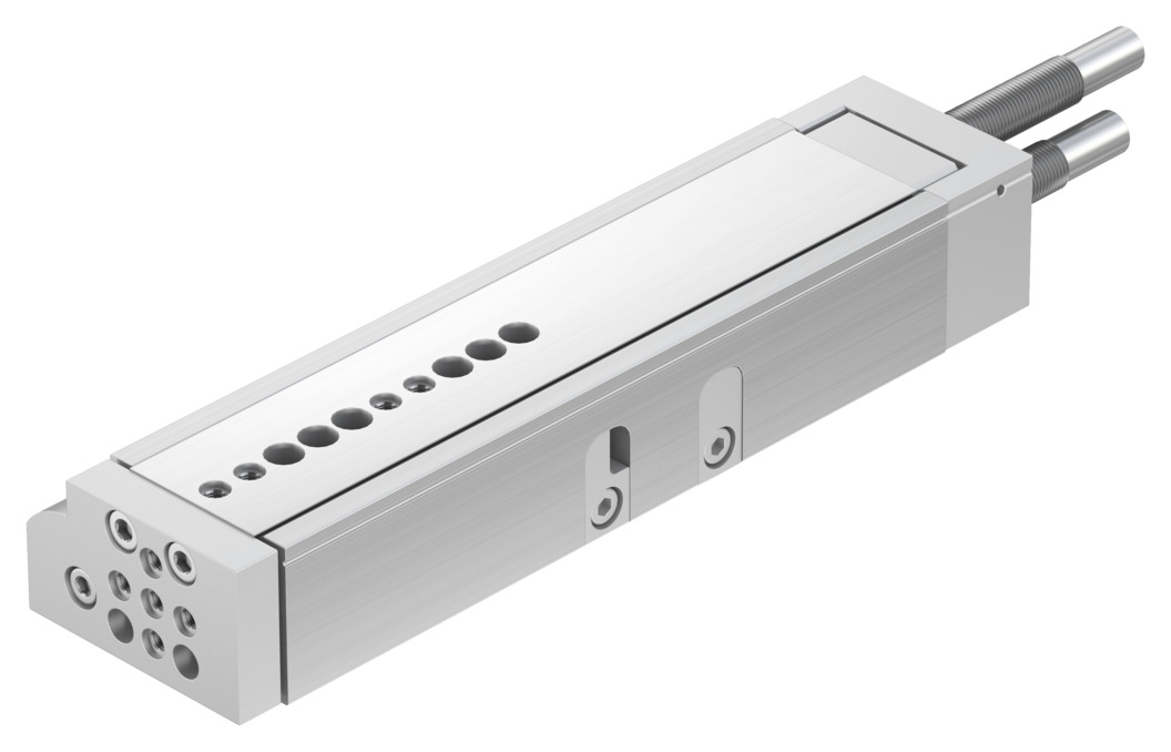 Festo Mini Slide Drive, Series: DGSL, 16 mm Cylinder Bore, 100 mm Stroke, 2850 N Maximum Force, Double-Acting Cylinder Action, M5 Port, 1 to 8 bar, 0 to 60 deg C, Through Hole Mount, Wrot Aluminum Alloy, Anodized, 124 to 193 mm L x 65 mm W x 40 mm H
