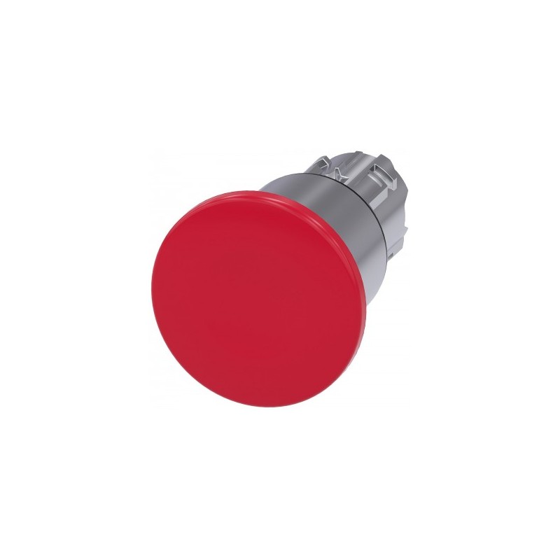 Mushroom pushbutton, 22 mm, round, metal, shiny, red, 40 mm, 3 switch positions, latches after pushing in, unlatches by pull-to-unlatch mechanism to center position, after pulling out the button Retraction to center position