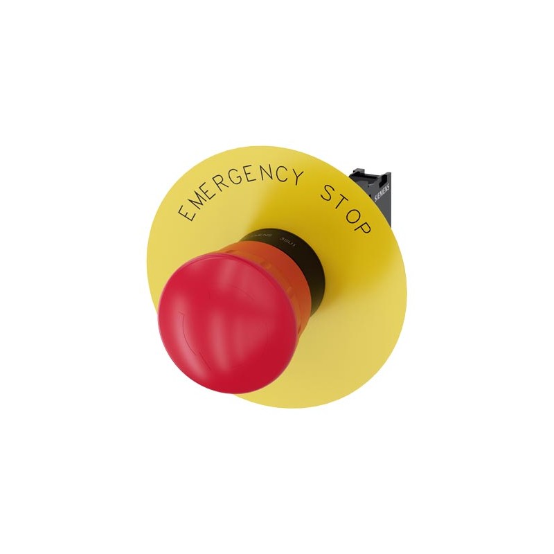 EMERGENCY STOP mushroom pushbutton, 22 mm, round, plastic, red, 40 mm, latching, positive latching, Rotate-to-unlatch, with yellow backing plate, inscription: EMERGENCY STOP, with holder, 1 NC, 1 NC, screw terminal