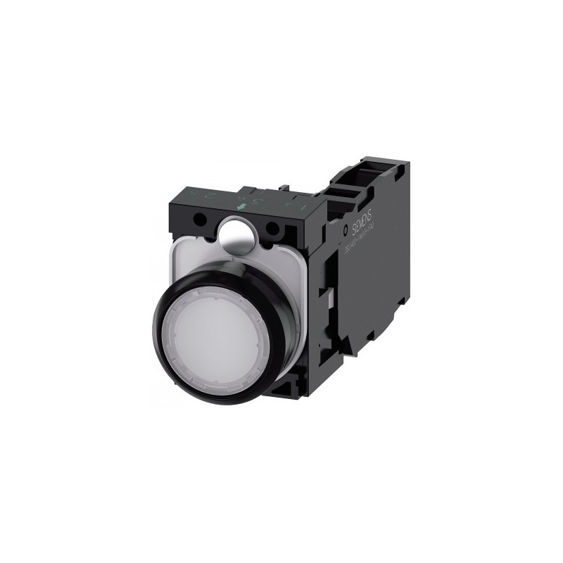 Illuminated pushbutton, 22 mm, round, plastic, white, pushbutton, flat, momentary contact type, with holder, 1 NO+1 NC, LED module with integrated LED 24 V AC/DC, screw terminal