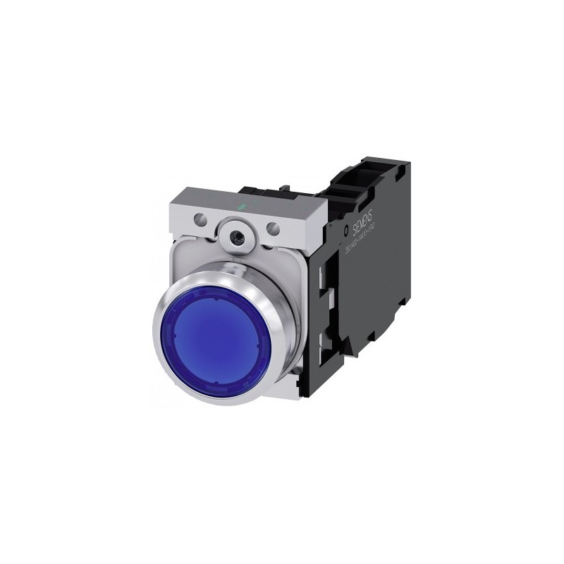 Illuminated pushbutton, 22 mm, round, metal, shiny, blue, pushbutton, flat, momentary contact type, with holder, 1 NO+1 NC, LED module with integrated LED 24 V AC/DC, screw terminal