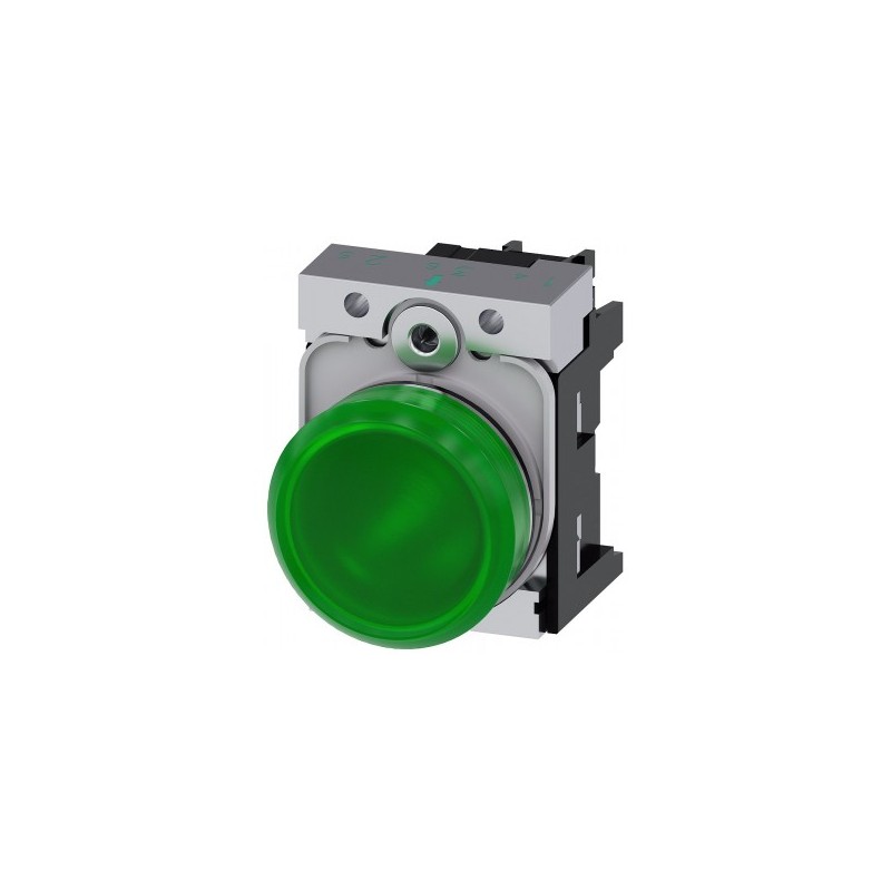 Indicator lights, 22 mm, round, metal, shiny, green, lens, smooth, with holder, LED module with integrated LED 24 V AC/DC, screw terminal