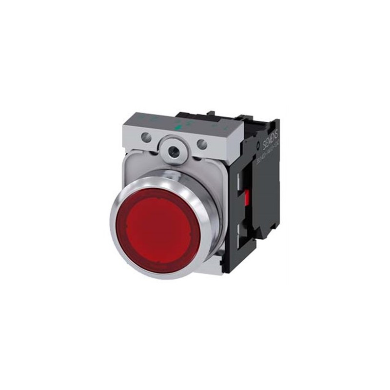 Illuminated pushbutton, 22 mm, round, metal, shiny, red, pushbutton, flat, momentary contact type, with holder, 1 NC, LED module with integrated LED 230 V AC, screw terminal