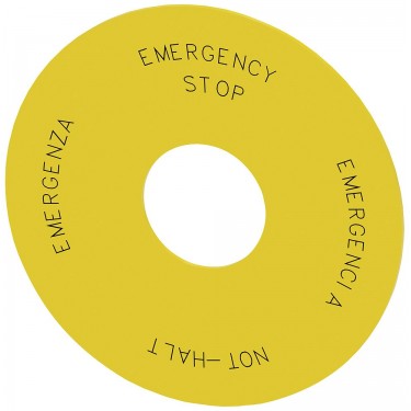 Backing plate round, for EMERGENCY STOP mushroom pushbutton, yellow, self-adhesive, outer diameter 75 mm, inside diameter 23 mm, with inscription: EMERGENCY STOP, EMERGENCY STOP, EMERGENZA, EMERGENCIA 4 languages: DE,EN,IT,SP