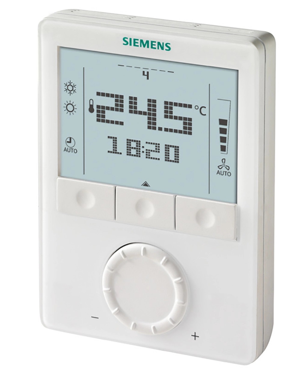 Room thermostat, AC 24 V, for fan coil units (3-speed or ECM fan), universal applications and heat pump applications. 7-day time switch. Outputs DC 0..10V or ON/OFF